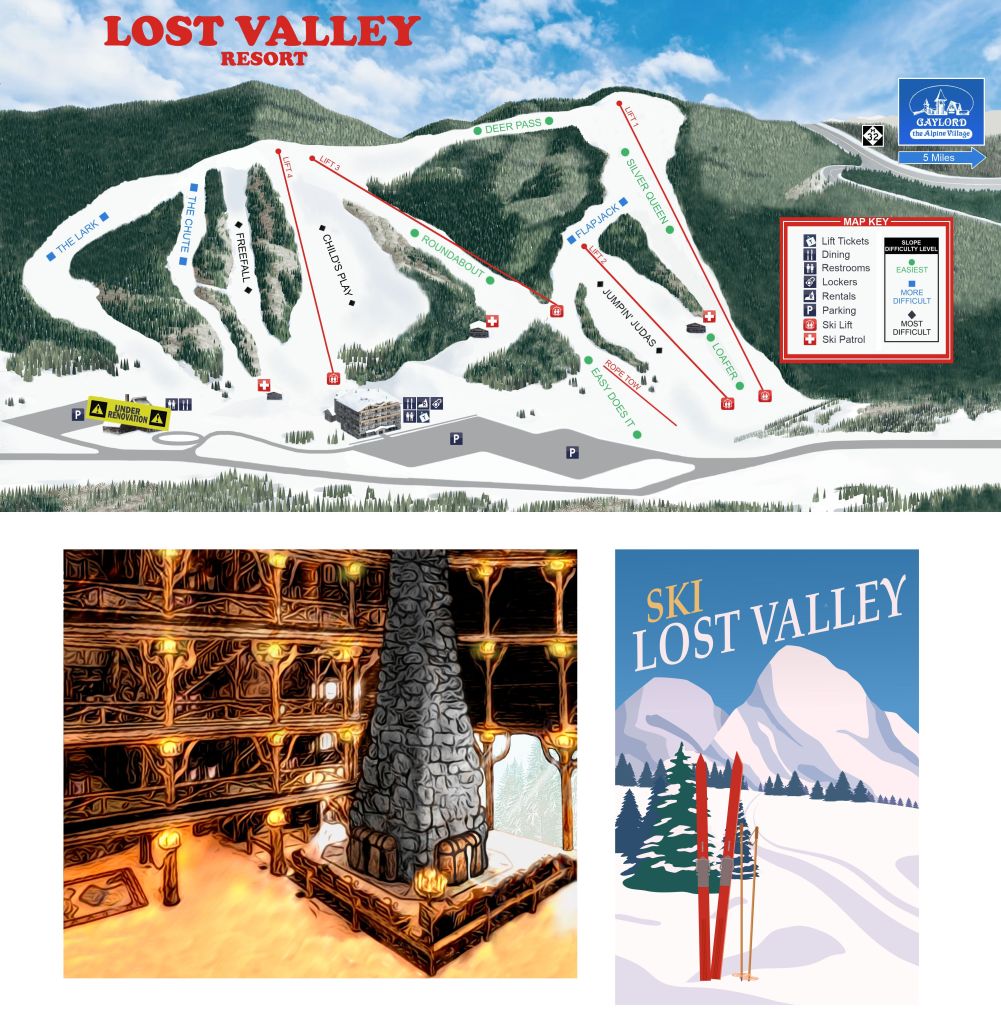 Lost Valley is a fictional ski resort located east of Gaylord, Michigan. Below is a trail map for the resort; a depiction of the fireplace that is the architectural highlight of the lodge; and an example of the “Lost Valley” lithographs displayed in each guest room at the resort.