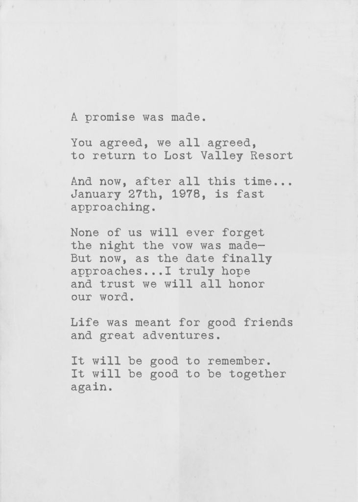 Fast forward ten years. John Robinson, now a pulmonary specialist, flies from California to Michigan for the ten-year reunion at the resort. He likely would have forgotten about the promised reunion if not for an anonymous reminder letter received months before. When He lands in Michigan, he discovers that a huge blizzard is descending upon the state.